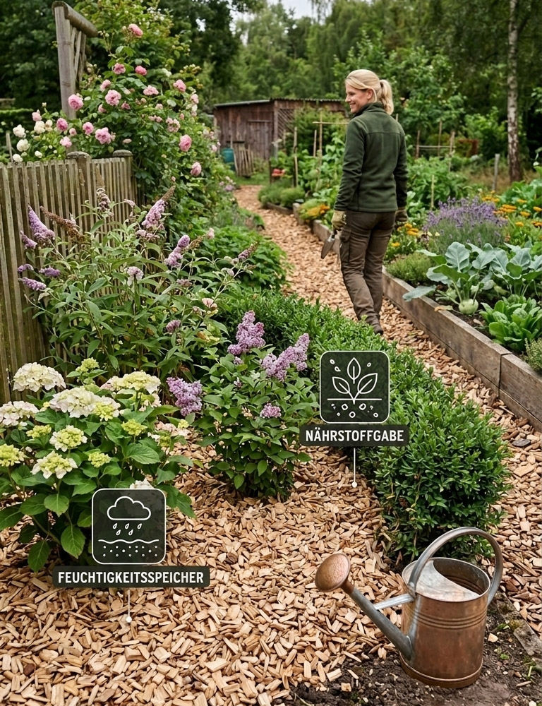 Holzhackschnitzel sind mein Geheimtipp für entspannte Gartenwege und gesunde Hecken. Sie sparen Zeit und Kraft – und man hat einfach mehr Freude im Garten.